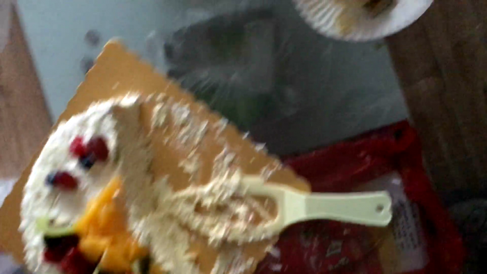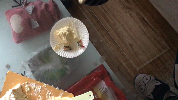 说来巧了,她在我这的时候刚好有粉丝送了个冰淇淋蛋糕给我,她很爱吃,于是就涂在鸡巴上喂她了