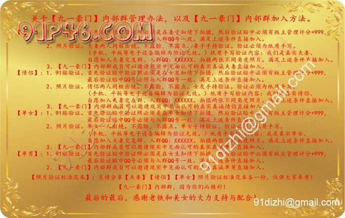 1、关于夫妻/情侣/单女验证:北上广不相信眼泪,交友圈只相信验证。如果大家对于上述条条框框的文字心存疑虑,我并不觉得你们足够真实真诚且真正准备好了,安安静静的做一名吃瓜群众其实也挺好。(备注:试图想凭91登录页面截图且无91验证贴入群的只能证明你是91视频区300大洋会员号,试图想凭结婚证或婚纱照入群的只能证明你是已婚单男,诸如此类的客官请自重!)