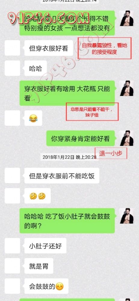 最后,必须要跟兄弟们分享两个很重要的观念,第一个就是约啪和聊骚顺序,你要知道你加这个女生的目的是为了约啪而聊骚,而不是为了聊骚而约啪,很多兄弟都弄反了,看了别人的聊天记录,哇塞,认为这个大神好会聊骚啊,太厉害了,太羡慕了,这有啥用?