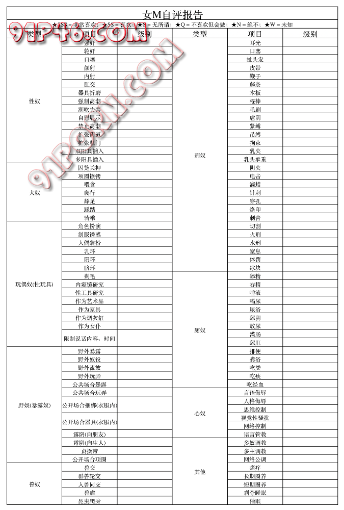 女M自评报告,字母圈自评表格