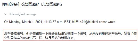 uc浏览器貌似会把用户的cookie存在云平台,然后不同用户的cookie会随机错乱。2年前发生过,现在又有。但是在海外的手机版uc浏览器没有发现有问题。uc用户们,你有发现过诡异的事情吗?91目前就是使用cookie来达到永久登录,但是你浏览器上的cookie可能是其他91网友的!所以你可能会登录到别人的账号! 大家讨论一下,你是什么情况下有类似的问题。最好把uc浏览器的版本写出来