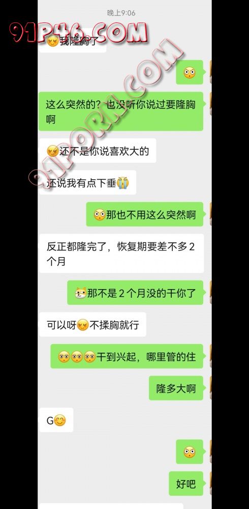 不声不响跑去隆胸,大晚上有一堆骚话,醉了醉了~2个月没的约她,早知道周末再约出来干一次了…看来是时候再找个新P友续续空档期了