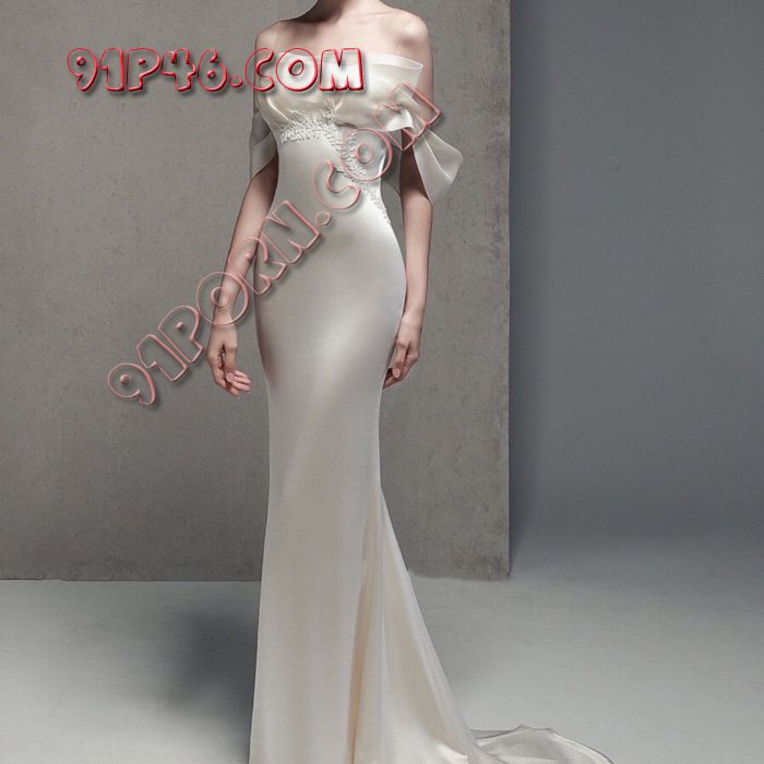 一身丝质半透吊带大露背拖地婚纱,露背就没法戴胸罩了,胸部贴个FUCKME的乳贴即可。