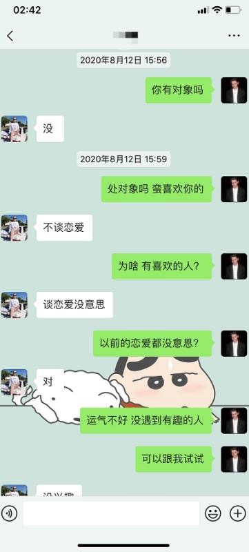 8月12号加上她的时候,其实她的反应很冷淡,是个“普通型”妹子,她会跟你聊天,但是感觉很平淡,比较高冷。