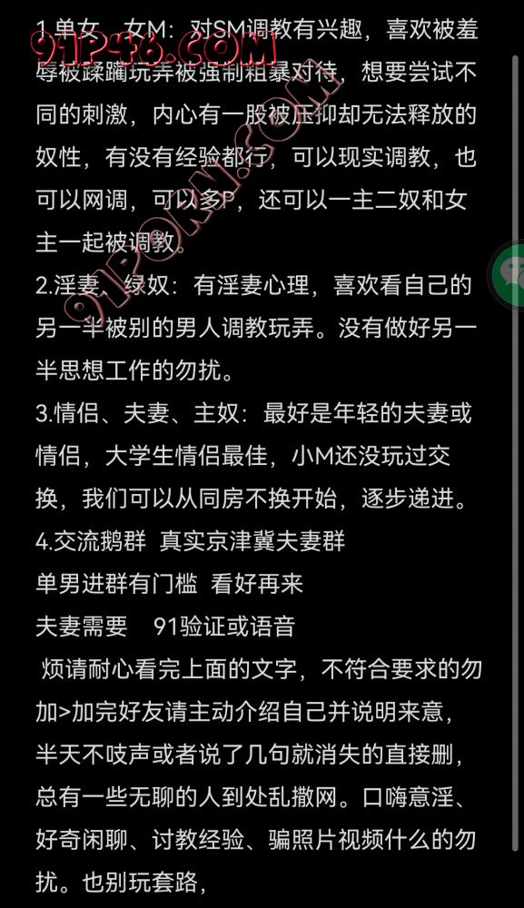 烦请耐心看完上面的文字,不符合要求的勿加>加完好友请主动介绍自己并说明来意,半天不吱声或者说了几句就消失的直接删,总有一些无聊的人到处乱撒网。口嗨意淫、好奇闲聊、讨教经验、骗照片视频什么的勿扰。企鹅:[email protected]@[email protected]@736 请备注来意