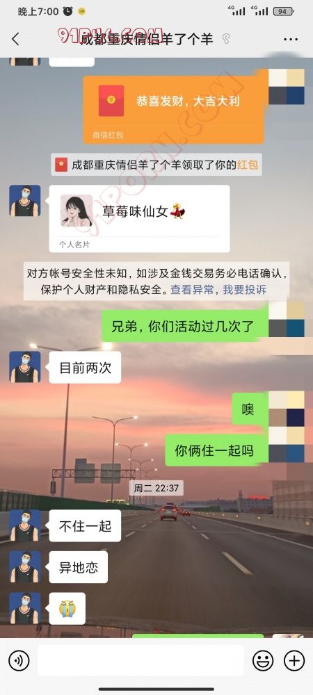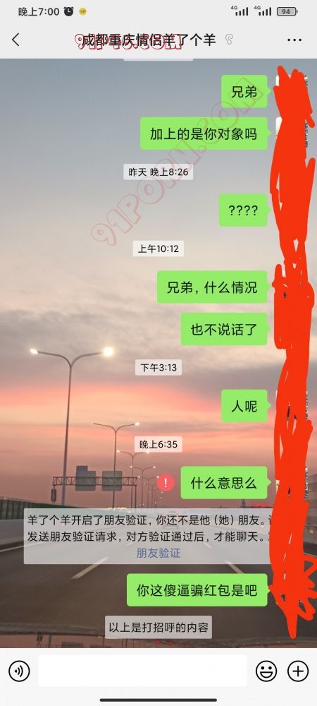 这就是个骗子,说自己是川渝的情侣,现在又变成上海的了。骗门槛的,大家不要相信,加上对方之后说是发了门槛加对方女友微信,发了加上之后说一句话就没声了,白天晚上发信息对方都不回复,这个所谓的女友微信就是对方自己申请的小 号改