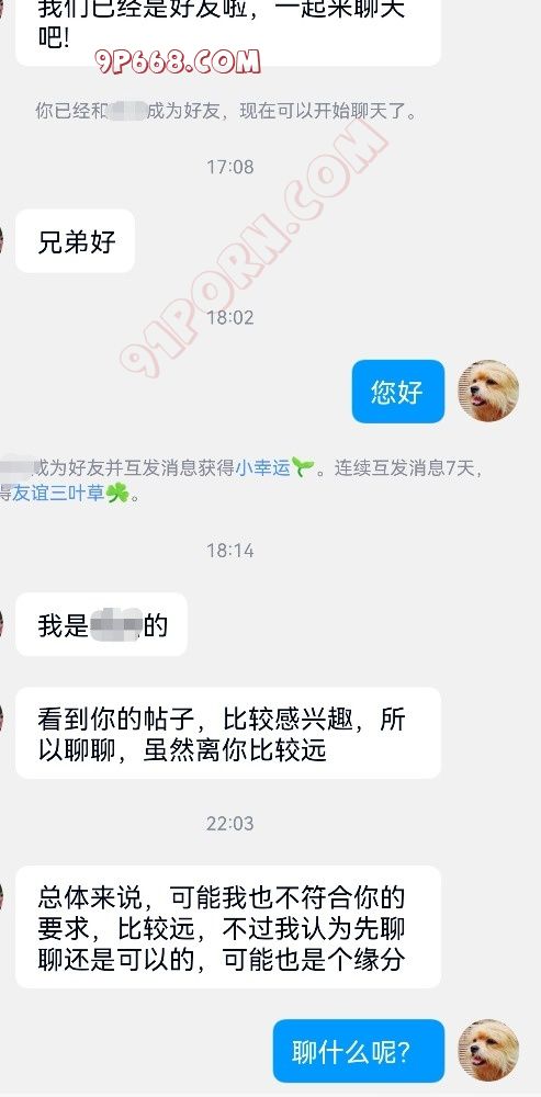 三、“我看到你的贴子,比较感兴趣,所以聊聊”,这句话我已经想删除他了,何为“比较”?不能嘴巴甜一点说“十分感兴趣”?“非常感兴趣”?然后“所以聊聊”,这意思你感兴趣就聊聊,不管我对你感不感兴趣都得和你聊?