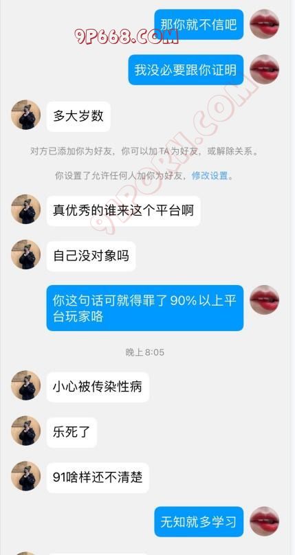 本来前两天发帖子征集优秀单男,承蒙91各路兄弟姐妹抬爱最少百八十个人加了QQ,因为人数众多所以仅仅草草筛选了一下,无奈就遇见了这样一个人,本来有照片我是想给打码的,但是此人小小年纪出口却极其恶毒,说91平台99%都是屌丝,各位夫妻情侣自行避雷,记住此人长相,以免自误