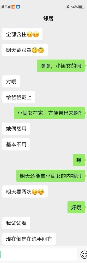 邻居单身,一儿一女,闺女17,儿子11,和我在一个小区,邻居操了两年了一开始就开始调教她幻想闺女也加入,今年才有所突破,啥都可以说,她闺女内裤现在都是我买,旧的内裤她旧说扔了,其实给我了。妈妈是完全同意我操闺女了,接受度极高。(我称呼她大闺女,称呼她女儿小闺女)。今晚她拿闺女内裤自慰了。正在聊天。 .
