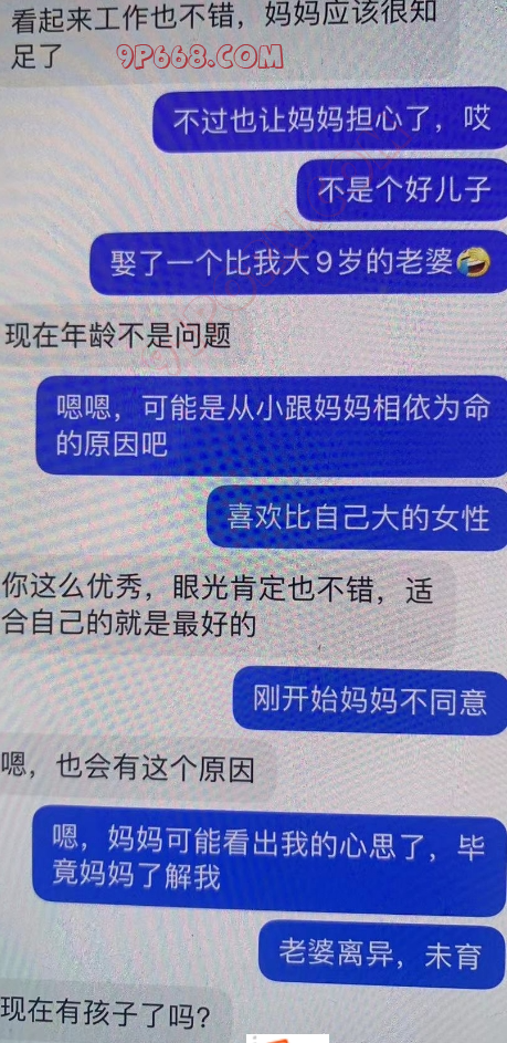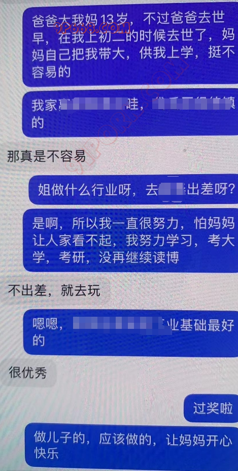 儿子加我后,经过简单沟通,儿子在外地上班,妈妈在 当地上班,儿子1998年,妈妈1974年,通过抖音关注妈妈,结果妈妈回关了,还是用老套路,介绍自己对单身妈妈的孝顺,然后引入恋母话题,引导妈妈好奇此话题。