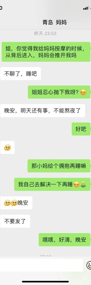说的对哦,加上第二天,估计妈妈已经被我撩的春心荡漾的不行了,后来结束了话题,睡觉了,今天不怎么理我,估计是昨天聊的太猛了。