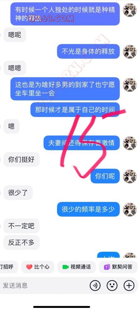 后来加了微信。可能那会稍微清醒了点!有点后悔了!但聊着聊着又自己发骚了!那天其实我有点忙的!她总以为我不理她!最后自己用手扣高潮了!水确实多!流了一地的水!听见她的淫水滴答滴答的滴下来!确实是个骚货!但是呢第二天估计进入了佛系状态!觉得对不起她老公!就把我拉黑了!这给我整得!我以为就到此结束了!没有后续了!谁知道晚上她又自己把我拉回来了!又是一顿发骚!很想和我文爱!那时候已经兜兜转转拉黑我好几回了!我慢慢也失去了兴趣!昨晚又找我聊!我故意为难她。后来又给我拉黑了!也无所谓了!白天给我拉黑!晚上想要了又给我拉回来!都说男的拔吊无情!女人干起这类事也是不遑多让!其实中间还有其他聊天的!我就截了一小段发出来了!其他的就不发了!这帖子算闭环了!各位江湖再见!
