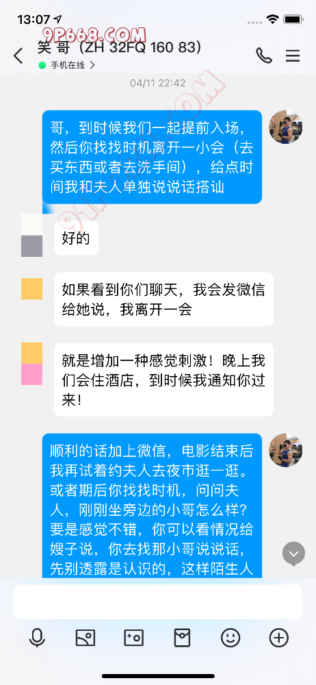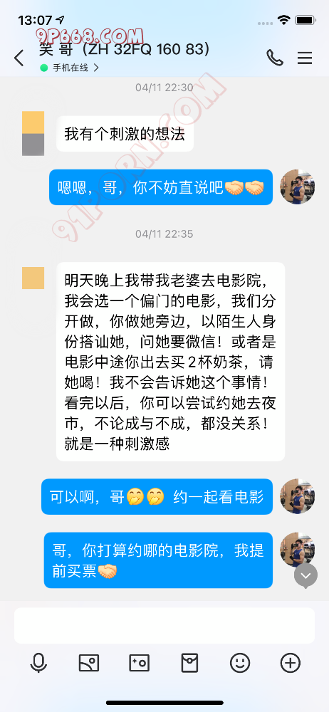 这次要分享的2024年四月13号的一次活动,这对夫妻是珠海同城的,32岁左右,之前交流了几天,没想到我和丈夫交流的非常愉快,可能是我比较懂他绿帽的心里状态吧,我们想好了活动内容(电影院陌生人搭讪剧情),然后安排了活动时间,当然这一切对他妻子都是保密的,他妻子应该也会享受这种陌生带来的刺激和兴奋,他妻子只以为是丈夫临时起意想去看电影,其余的内容一无所知。
