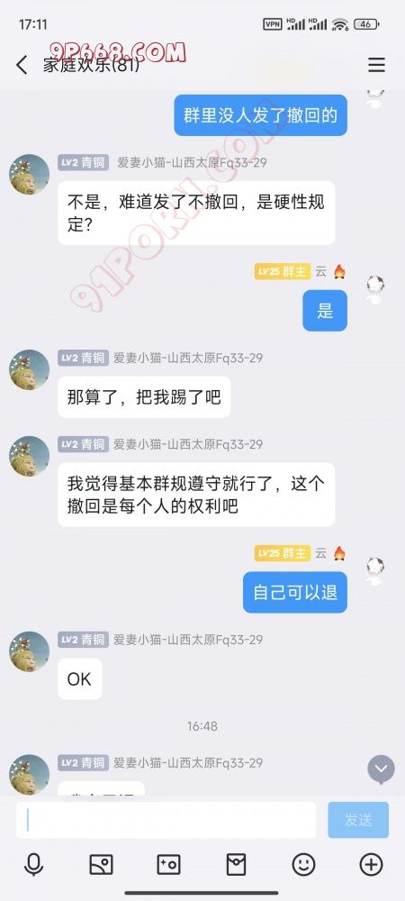 是啊,我全程没说过脏话,没退群之前,这个群主没看到我分享的老婆,我还专门又为他发了一次,还专门@他,让他看了之后才撤回。结果你看他的态度,蛮横的很,非常牛气,哈哈,不知道是谁给的他自信,还自定群规,不允许别人分享的撤回。我来91发个帖子吐槽一下这个不可理喻的群主,也没指名道姓,结果他闻着味儿就来开炮了,哈哈,还截图发上来,生怕别人不知道他这个憨憨,笑死了。