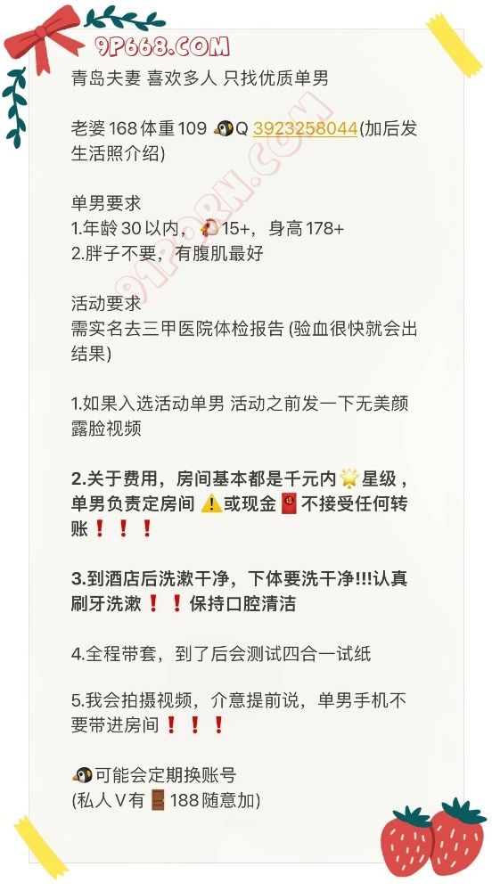 不错,顶一下,青岛老司机寻找单女或第一次玩的夫妻,只找一个,所谓器大活好(15+,曾经被量过17,我感觉也就15+,到底顶你是必须的,绝对的粗),幽默情趣,强有力的征服欲,主打一个安全干净,SM、外露、3P、夫妻、调教都玩过,别害怕,叔是循序渐进合适玩啥看对方,慢慢进行探讨。已经退隐8年多了,退隐8年中只交往一个6年,从她未婚到已婚,现在她去北京了,重新走上寻找之路,近两年也见过,但是不合适,请大家也爱惜自己,干净卫生是玩的基础。大叔86的,174,154,散打出身,一身的力气 ,普通人,发际线都往上走了点的人了。注重真诚,注重尊重,注重干净,注重娱乐,注重现实;现在时间不多偶尔想起时互相慰籍,我按倒你的时候让你服让你求饶,情趣的时候满足你各种幻想和场景,站好立场,互不干涉其它。联在↓,真诚找我。