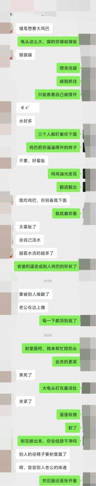老婆90后,过年有事提前带孩子回老家了,有两周没见。之前papa的时候也会说些让别人来操你之类的话,要么不搭理,要么敷衍一两句。老婆的敏感点在奶头,刚结婚那会只喜欢摸跟吸,后来开始喜欢被捏被揪,我开玩笑是不是每天在公司被人捏,奶头都大了一圈,她说是啊是啊,你不喜欢吗?papa的时候,捏住奶头就会夹得特别紧。这么多年调教只停留的偶尔的言语,聊骚是一次没有过,昨天晚上鬼使神差,就聊上了,老婆的反应真有些出乎我意料,看着完全不像个新手,大家自己看截图体会吧。PS,结婚的时候还是处女,中间在一家公司上过一两年班,也是那时候开始会刮毛,后来就跟我一起做点小生意,出去乱搞的机会不大,不过我平时忙,应酬也多,没太多时间管她。