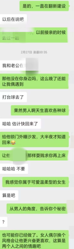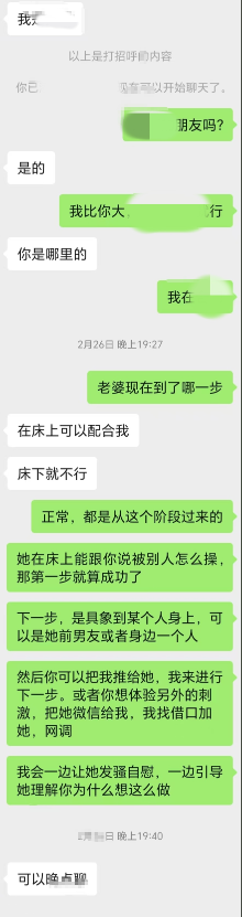陆陆续续给新手夫妻开发了不少,有成功有失败,最快一周最慢三年,这次是创了新纪录。老公把老婆微信给我,假装加错联系上,当晚聊自慰,第二天聊受不了,把老公微信给我,三人群老婆直接在群里释放自我。聊天太长,先放第一段,过两天发更刺激的第二段。