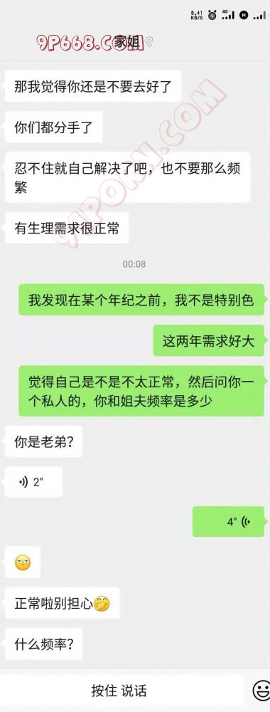 接上面,之前我们已经顺利从恋爱话题过渡到性,姐姐还很正经的让分手就不要再复合,开导弟弟有需求很正常。殊不知我们是项庄舞剑,意在沛公我让他把话题进一步深化,就像一个刚接触性的懵懂少年,说自己在某个时间突然对性有很强的欲望,充满疑问,遂向自己的好姐姐咨询讨教。姐姐自然会说正常,色弟弟随机询问她和姐夫的做爱频率。姐姐一开始怀疑了一下,说实话当时我也懵了一会儿。好在反应迅速,让他发段语音,打消疑虑4677506